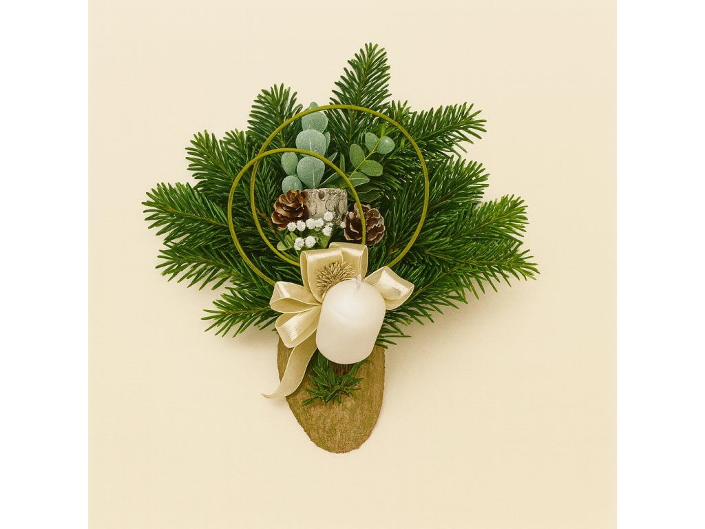 Dřevěná podložka z břízy, ke které je pomocí hřebíku připevněna placička z chvoje, vánočně zdobeno šiškami, bodláky, mašlí a svíčkou v různých vánočních barvách, tj. červená, zlatá, krémová.