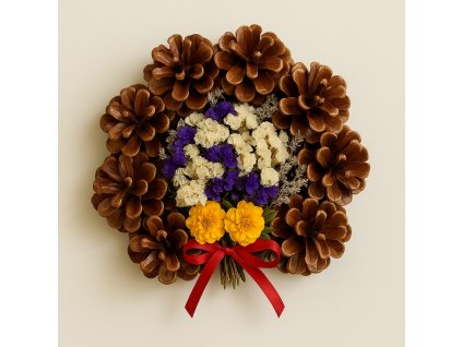 Věnec je tvořen ze šišek borovice černé, šišky jsou k sobě svázány drátem. Šišky jsou ve dvou řadách a jsou přelakovány. Věnec je zdobený a zabalen do celofánu.
