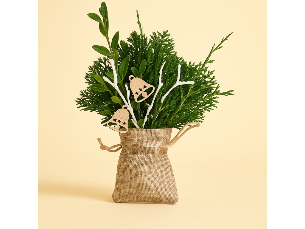 Jutový pytlíček s chvojovou placičkou (mix chvoje), dvě dřevěné ozdobičky, velikost výrobku cca 20 cm.