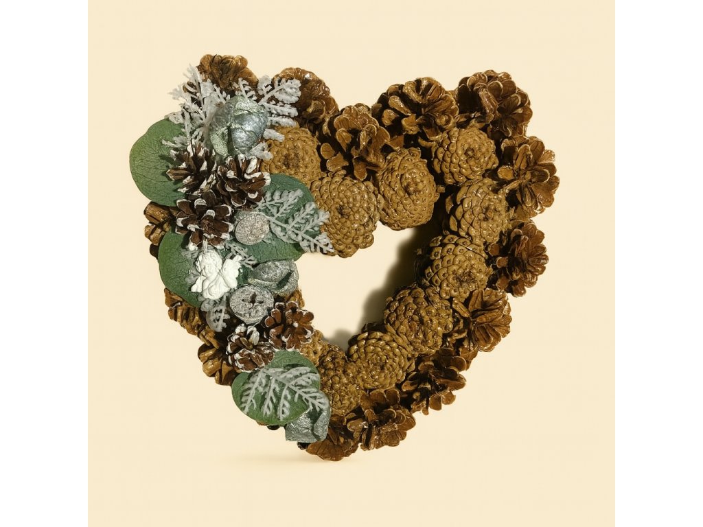 Srdce je tvořeno ze šišek borovice černé, šišky jsou k sobě svázány drátem. Šišky jsou ve dvou řadách a jsou přelakovány. Věnec je vánočně zdobený.