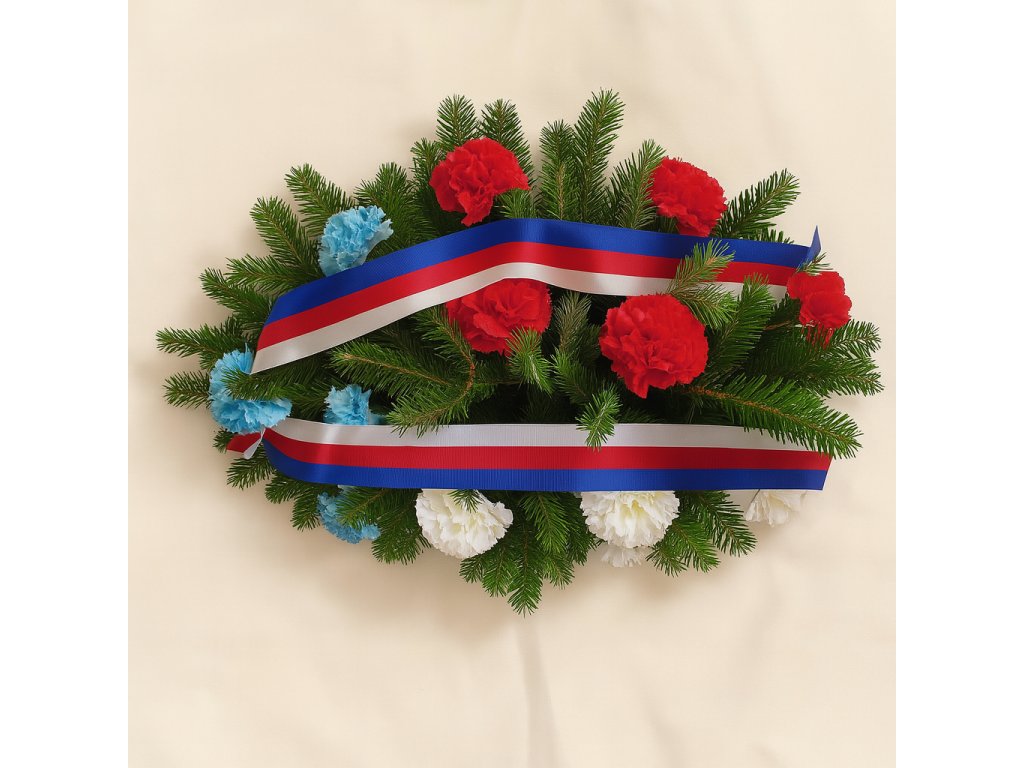 Smuteční kytice - chvojová bačkora jako podklad, vypichovaná z chvoje a umělých květů barvy bílá, červená a modrá, stuha trikolora. Vhodné na státní svátky. Kytice velká je o rozměrech 60x40 cm.