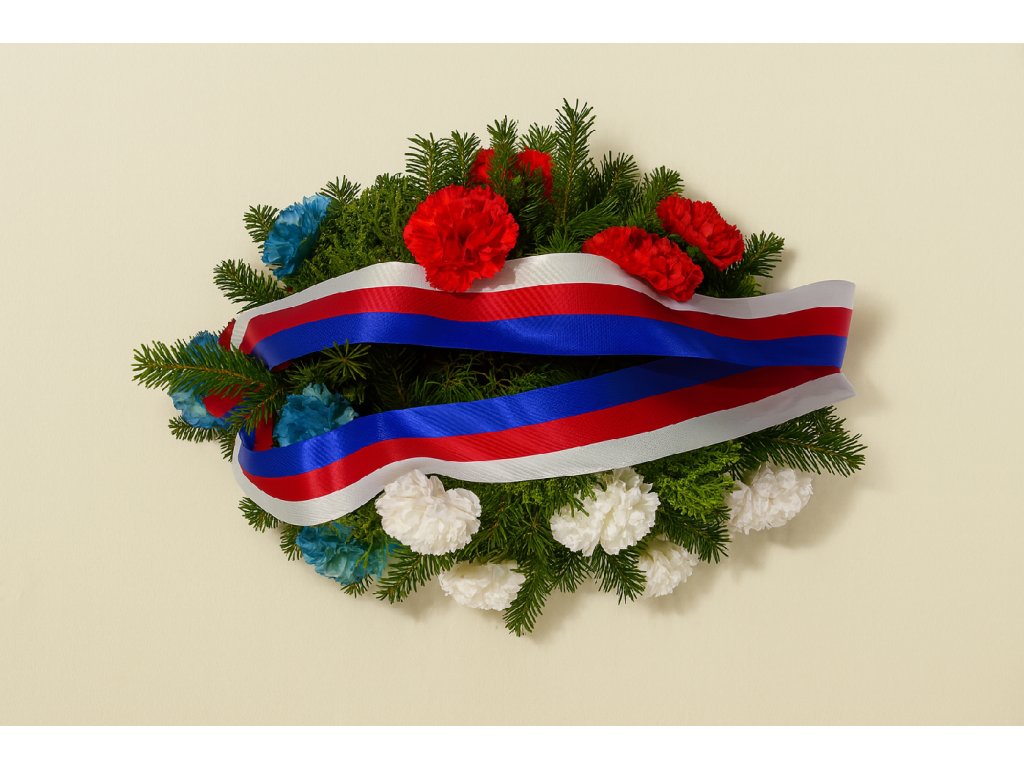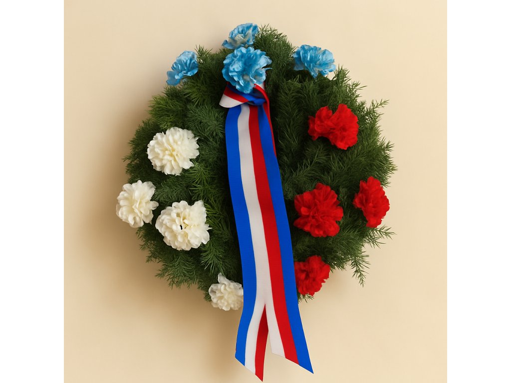 Smuteční věnec - slámový podklad Ø 30 cm, vypichovaný z chvojí a umělých květů barvy bílá, červená a modrá, stuha trikolora. Vhodné na státní svátky.