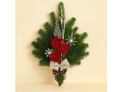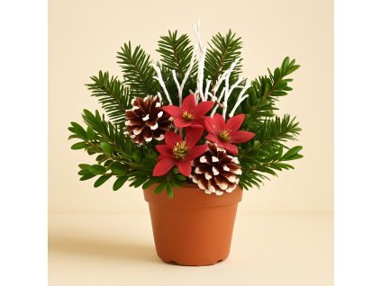 květník přírodní: kytkou ze sušiny dozdobenou červenými plody (jablíčko, cesmína, ...), šiškami, bílou břízou a mašlí.