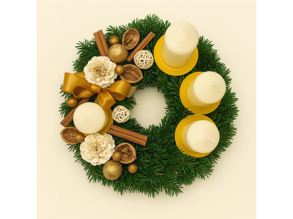 Slámový podklad, ke kterému jsou pomocí drátu připevněny větvičky jedle. Jedná se o větvičky z čerstvé jedle kavkazské z českých plantáží. Věnec je vánočně dozdoben viz. ilustrativní foto; svíčky (různé barvy: červená, fialová, bílá, krémová), věnec je dále dozdoben do barvy svíček mašlí, šiškou, skořicí, dřevěnou dekorací, vánočními ozdobami.