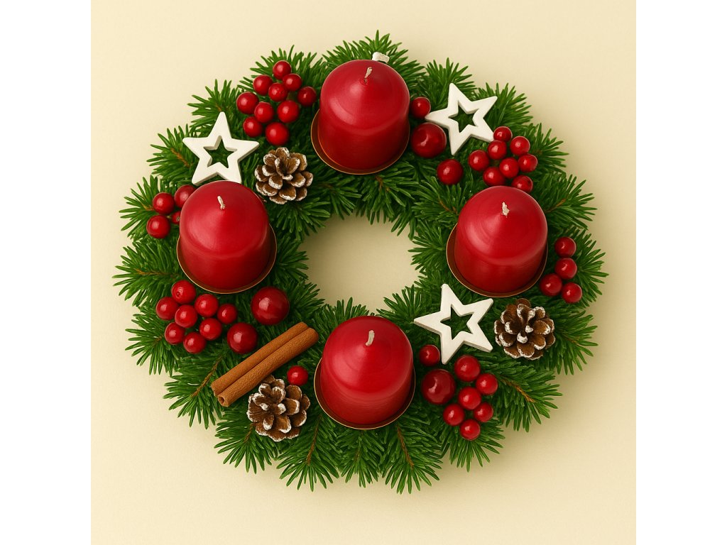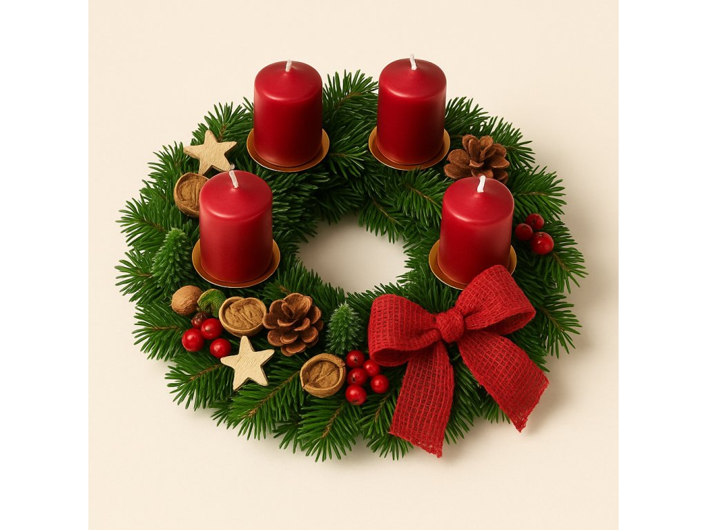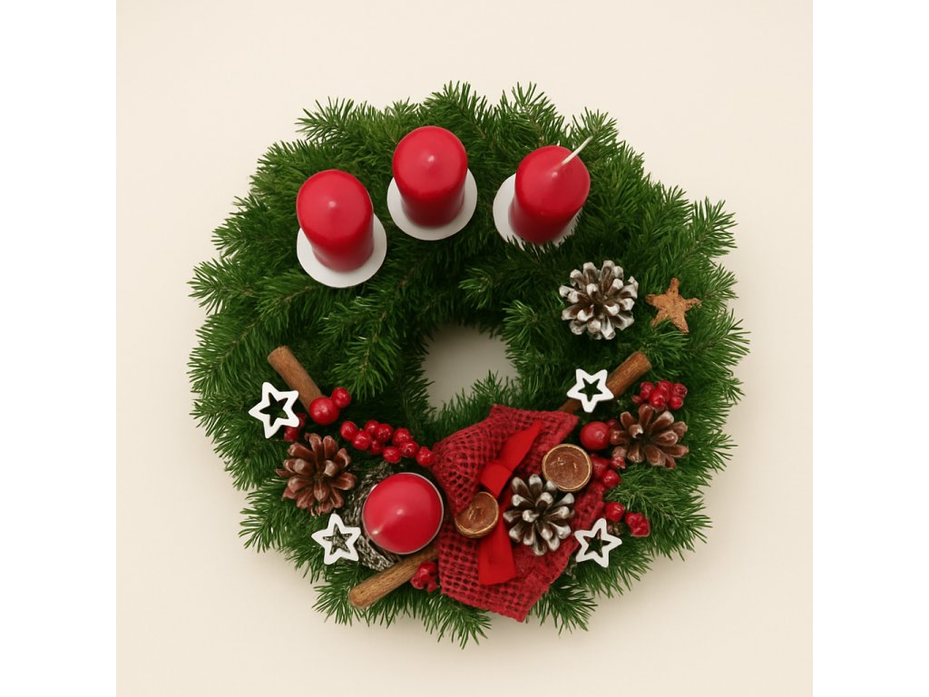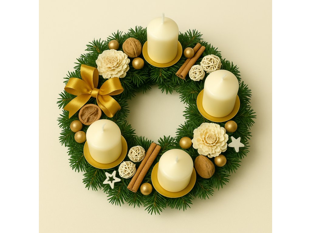 Slámový podklad, ke kterému jsou pomocí drátu připevněny větvičky jedle. Jedná se o větvičky z čerstvé jedle kavkazské z českých plantáží. Věnec je vánočně dozdoben viz. ilustrativní foto; svíčky (různé barvy: červená, fialová, bílá, krémová), věnec je dále dozdoben do barvy svíček mašlí, šiškou, skořicí, dřevěnou dekorací, vánočními ozdobami.