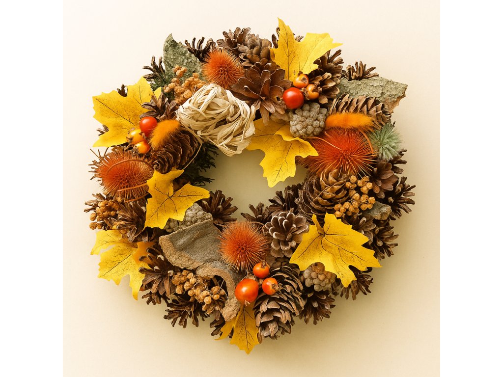 Slámový podklad ∅ 20 obalený krepovým papírem. Vnější i vnitřní strana věnce je vypíchána ze šišek (mix druhů). Mix přírodního materiálu a umělých přízdob.