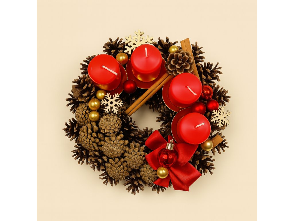 Slámový podklad obalený krepovým papírem. Věnec je tvořen z 1/3 šiškami borovice obecné, které jsou vypíchány do slámového podkladu, do zbývajících 2/3 věnce jsou umístěny svíčky (různé barvy: červená, fialová, bílá, krémová), věnec je dále dozdoben do barvy svíček mašlí, šiškou, skořicí, dřevěnou dekorací, vánočními ozdobami.
