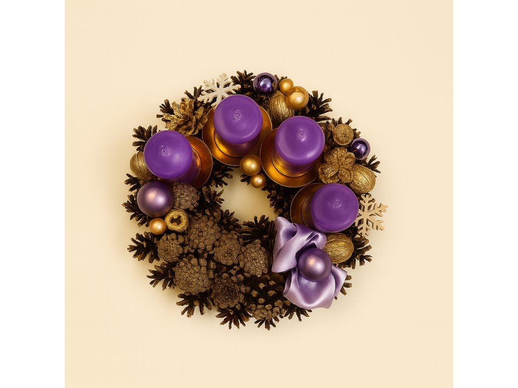 Slámový podklad obalený krepovým papírem. Věnec je tvořen z 1/3 šiškami borovice obecné, které jsou vypíchány do slámového podkladu, do zbývajících 2/3 věnce jsou umístěny svíčky (různé barvy: červená, fialová, bílá, krémová), věnec je dále dozdoben do barvy svíček mašlí, šiškou, skořicí, dřevěnou dekorací, vánočními ozdobami.