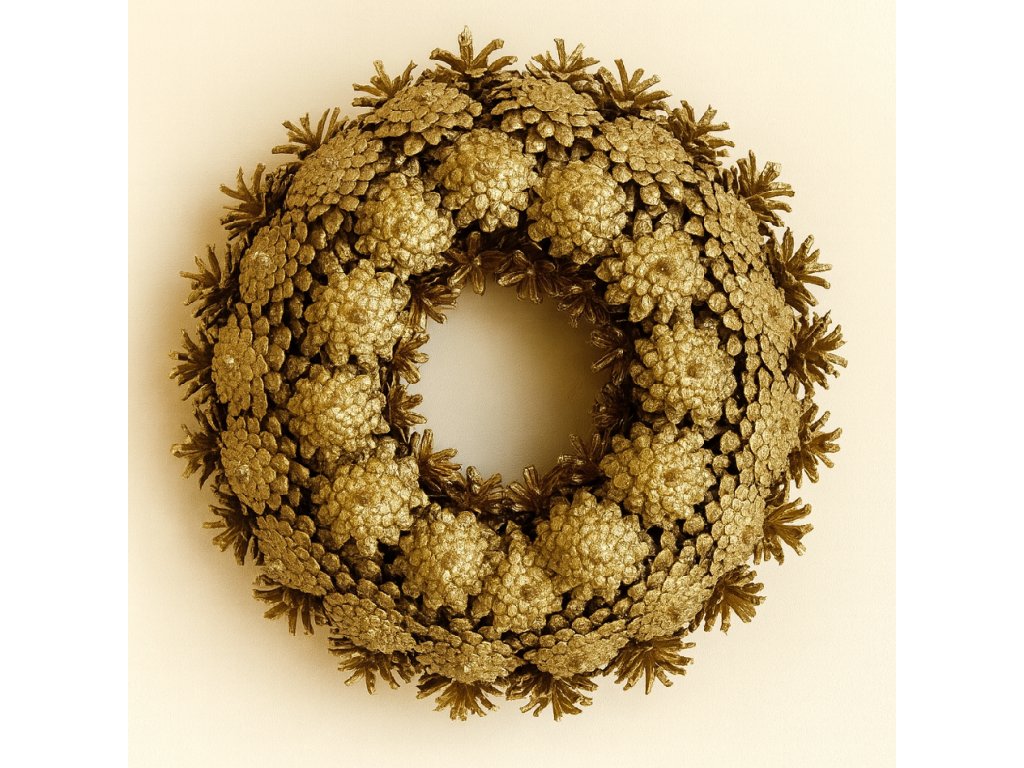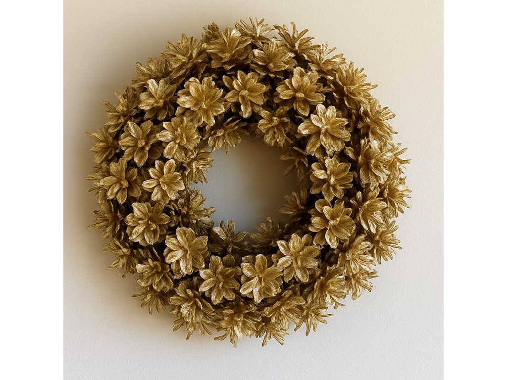 Slámový podklad obalený krepovým papírem. Věnec je vypíchán ze čtyř řad šišek borovice obecné. Přízdoba je vyrobena ze sušených květin - statice sinuata, statice tatarika, slaměnky. Tyto věnce jsou baleny v komínech po 10 ks.