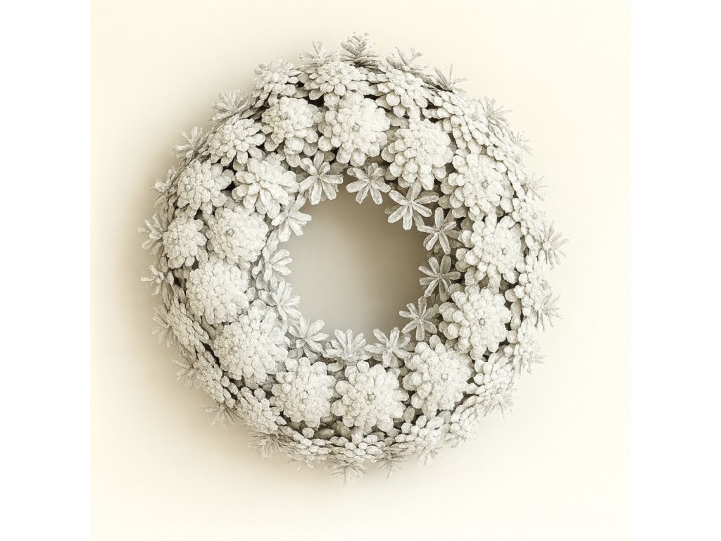 Slámový podklad obalený krepovým papírem. Věnec je vypíchán ze čtyř řad šišek borovice obecné. Přízdoba je vyrobena ze sušených květin - statice sinuata, statice tatarika, slaměnky. Tyto věnce jsou baleny v komínech po 8 ks.