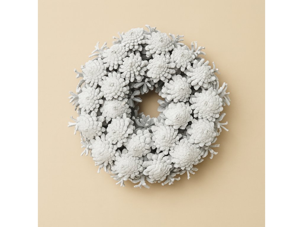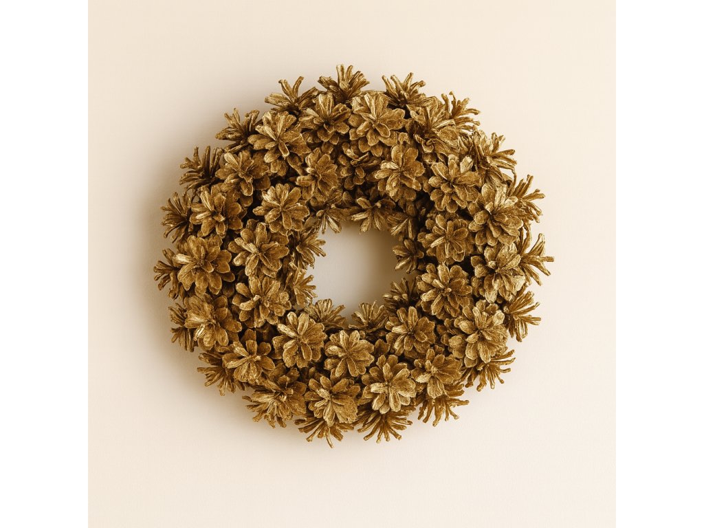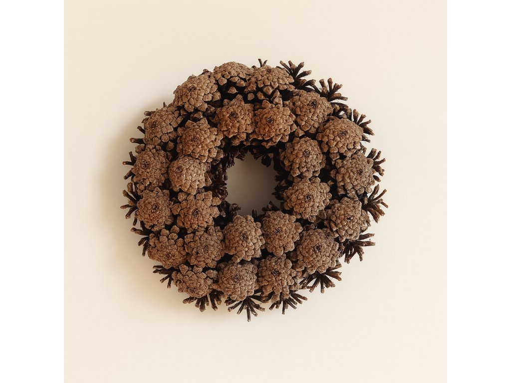 Slámový podklad obalený krepovým papírem. Věnec je vypíchán ze čtyř řad šišek borovice obecné. Přízdoba je vyrobena ze sušených květin - statice sinuata, statice tatarika, slaměnky. Tyto věnce jsou baleny v komínech po 10 ks.