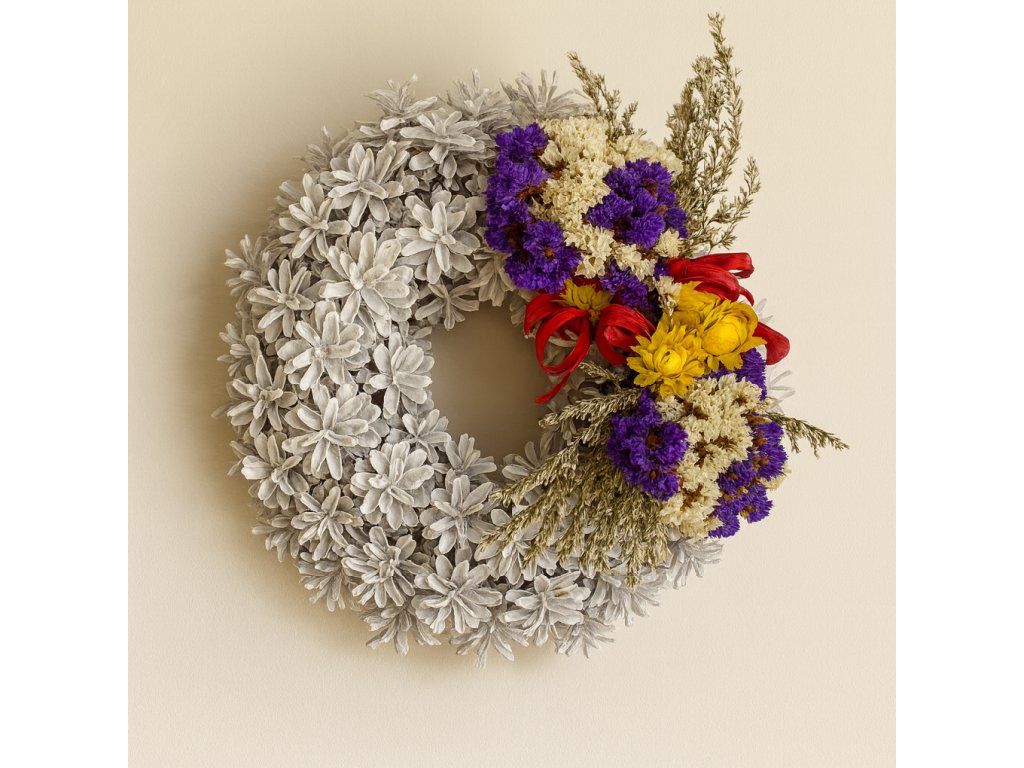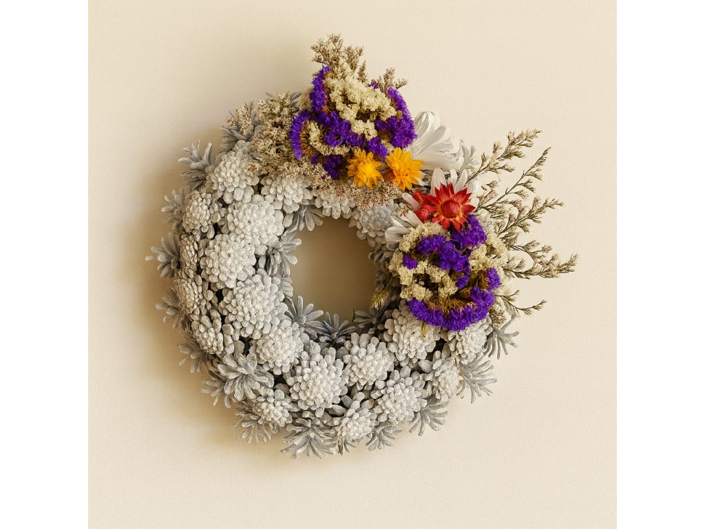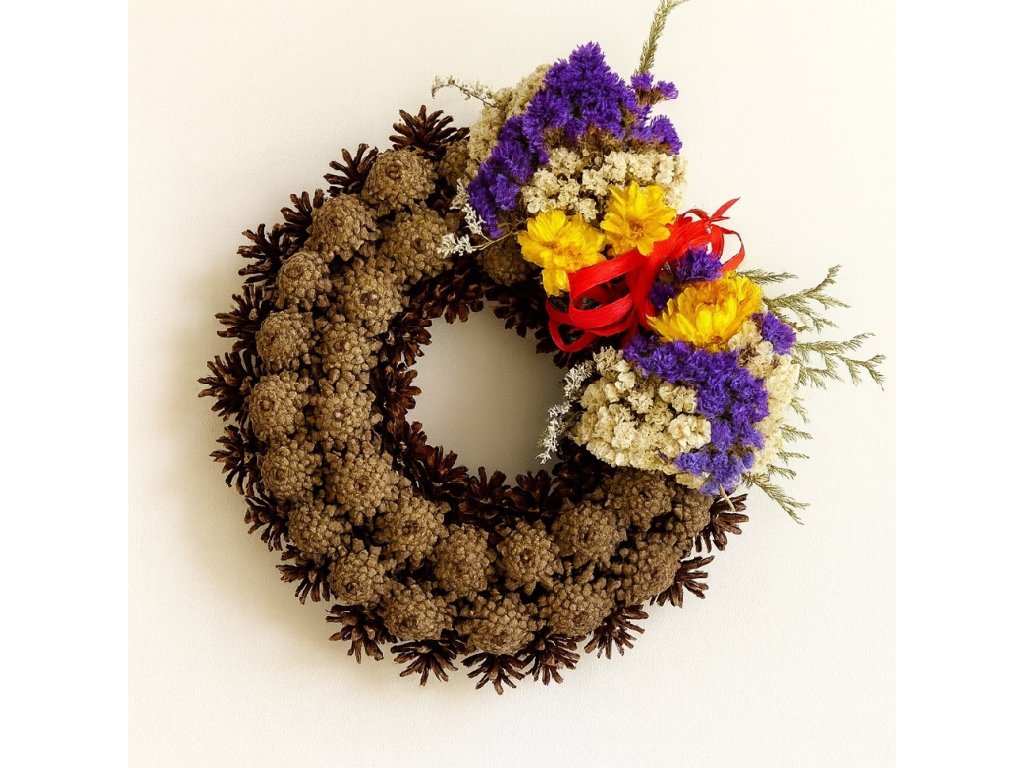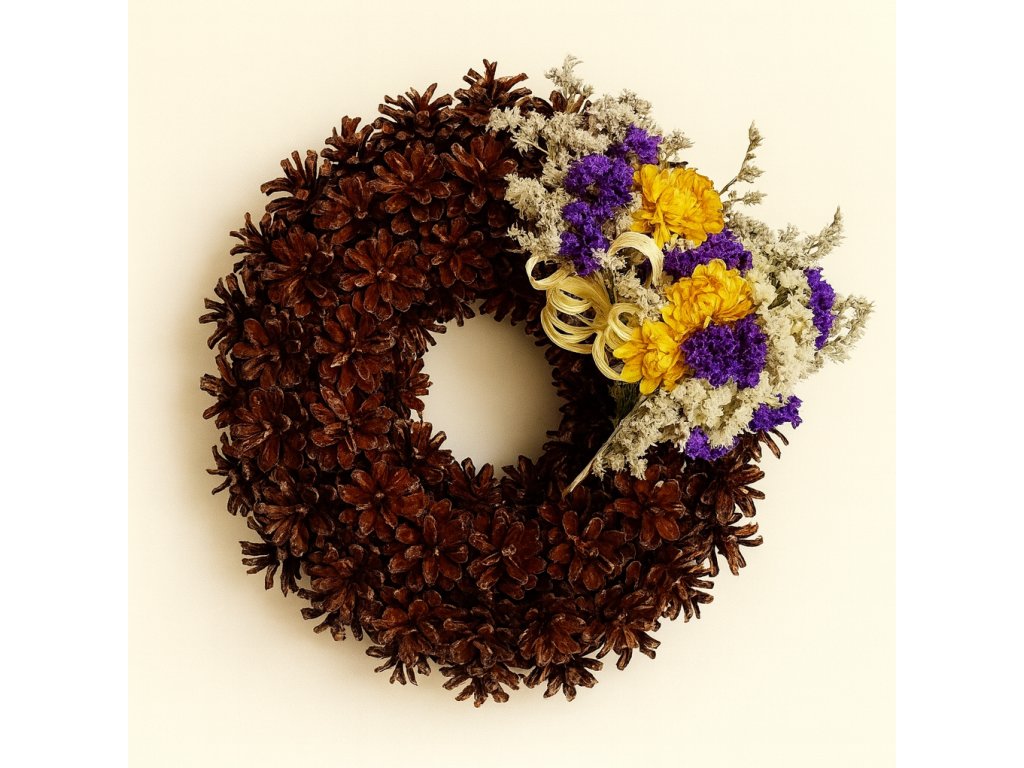 Slámový podklad obalený krepovým papírem. Věnec je vypíchán ze čtyř řad šišek borovice obecné. Přízdoba je vyrobena ze sušených květin - statice sinuata, statice tatarika, slaměnky. Tyto věnce jsou baleny v komínech po 8 ks a přízdoba je dodáván oddělené v kartonu. Pracnost na zdobení není téměř žádná, přízdoba se do věnce pouze zapíchne. Při tomto způsobu balení nedochází k poškození přízdob. Na věnce ∅ 25 jsou dodávány dvě přízdoby.