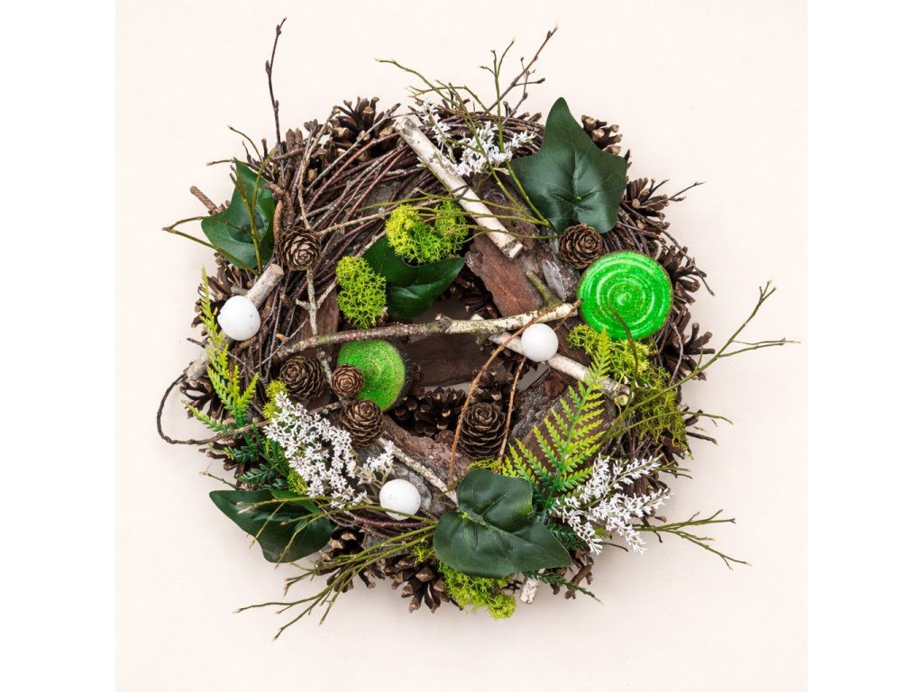 Věnec mechový Ø 20 - slámový podklad obalený přírodním přibarveným mechem a břízou - přírodně zdobený šiškami, borůvčím, tatarikou, kočičkami, malými vajíčky a přírodní mašlí.