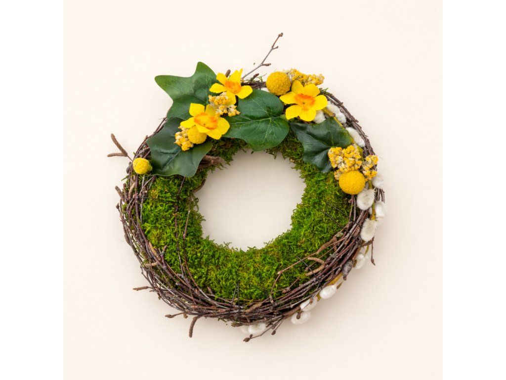 Věnec mechový Ø 20 - slámový podklad obalený přírodním přibarveným mechem a břízou - zdobený umělými květy narcisu a listy břečťanu.