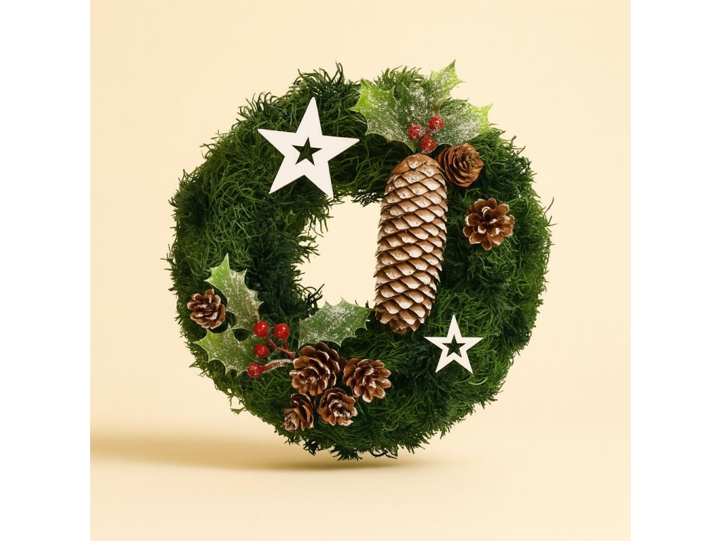 Věnec je tvořen z umělého chvojí, dozdoben šiškami, vánočními ozdobami, mašlí.